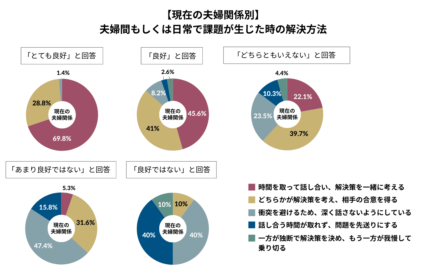 また、夫婦間もしくは日常で課題が生じた際の「解決方法」については、関係が良好な層ほど「時間を取って話し合い、解決策を一緒に考える」という能動的な対話を選択しています。一方で、関係が良好でない層では「衝突を避けて話さない」「先送りにする」といった回避行動が40%に達しています【図2、図3】。