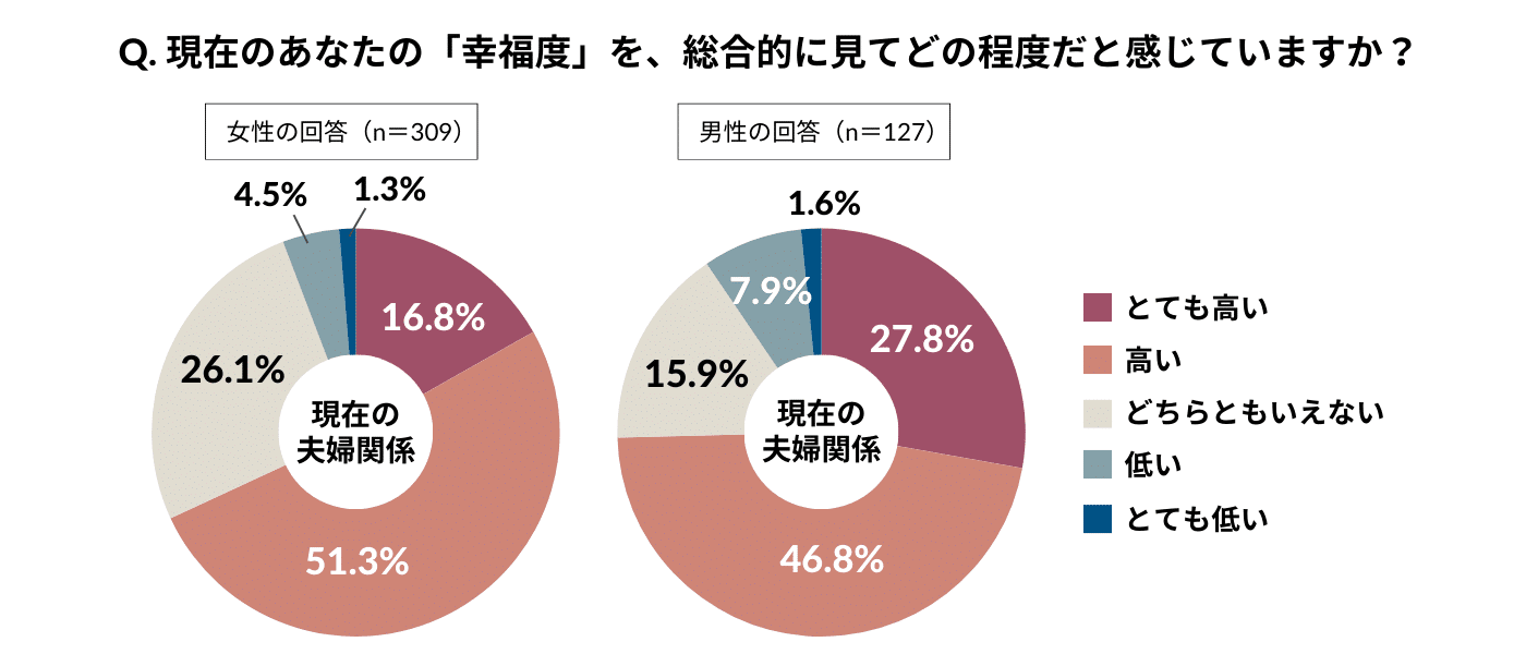 現在の夫婦関係の良好度について尋ねたところ、男性の84.2%が「良好(とても良好・良好の合計)」と回答したのに対し、女性は73.8%に留まりました。男性の方が約10ポイント高く関係を肯定的に捉えており、夫婦間で「関係性の認識」にギャップがある可能性が示唆されました。また、女性の方が「どちらでもない」という回答が多い傾向にありました(女性:18.4%、男性:9.4%)。【図1】。